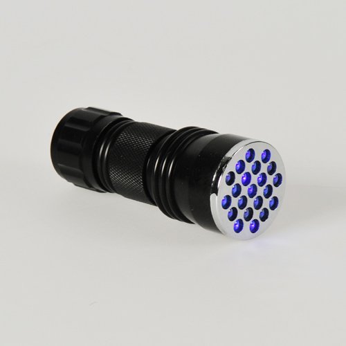 This type of flashlight is used for Money Detector, Credit Card, cash (currency), detection Glass Break Detection, Bugs/Insect Detection, Minerals Hunting, Automobile Air Condition, Fluid Leaking (Freon), Police use it for scanning the crime scene. 1 21-LED UV flashlights in black body finish Specifications: Bulb Type Longwave UV LED, 395nm nM Bulb Life 100,000 Hours Body Material Aluminum with "O" rings for water resistance Battery Require 3 x AAA Alkaline Battery (Not Included) Battery Life Approximately 20 hours on 3 AAA batteries Switch Type Press on, Press off from rear cap