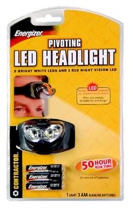 Lightweight, versatile and comfortable, the Energizer 3-LED Headlight is perfect for work that requires both hands. It puts light where you are looking with its tilt adjustment. Variable light sources allow you to choose the best illumination for the job; white spot or night-vision red, without changing lights. Also, this light mounts securely and can be comfortably worn around the head for long periods of time due to the adjustable, flexible head strap.